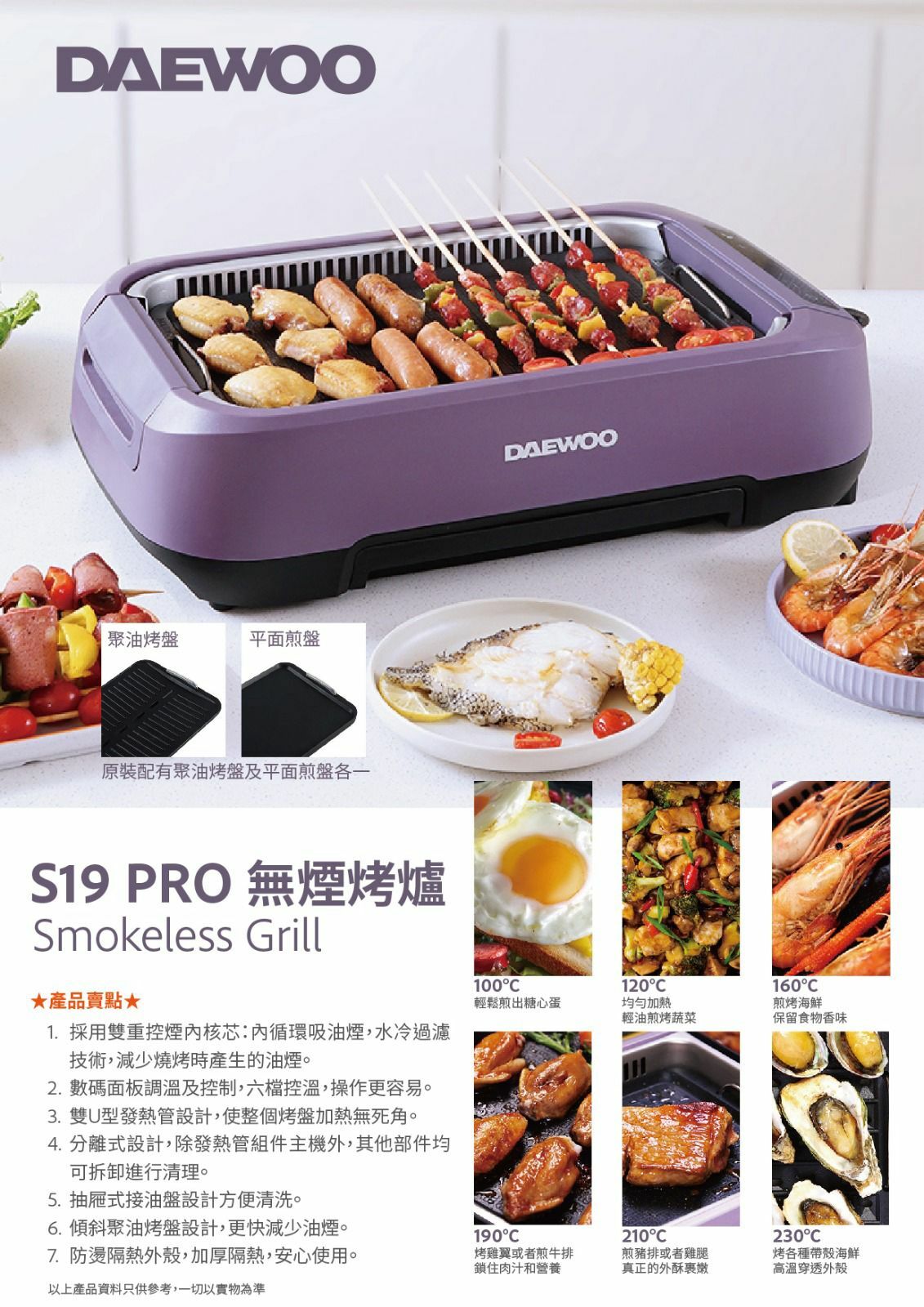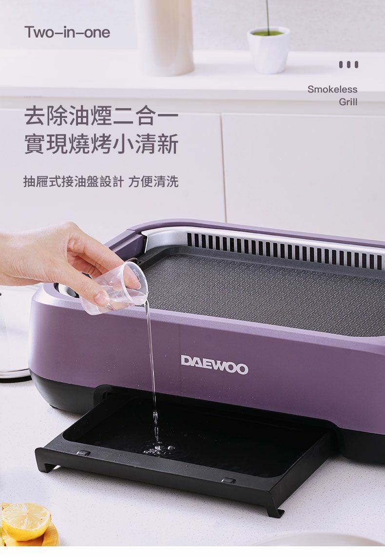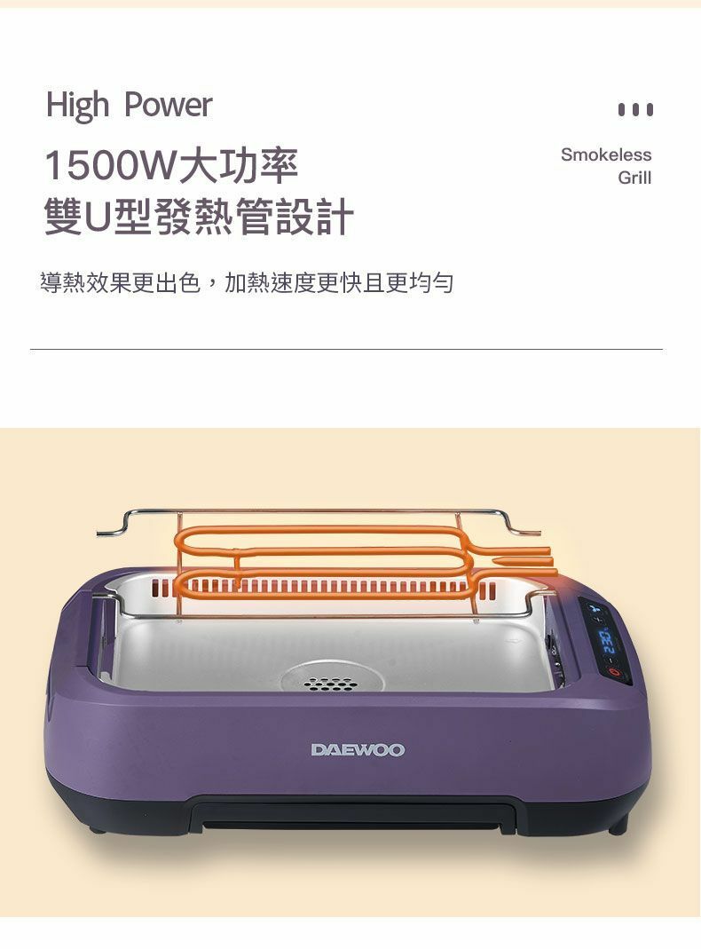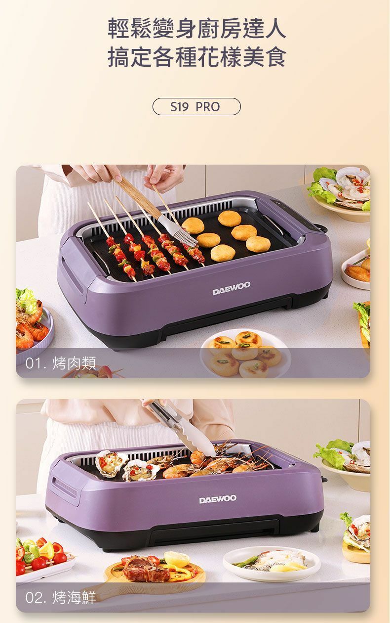 韓國大宇推出最新的S19 Pro 無煙燒烤爐,產品採用薰衣草紫色, 機體線條圓滑流暢, 雙U型發熱管設計, 使整個烤盤加熱無死角,更能轉換受熱均勻,燒烤時無需經常翻動食物,另産品的雙重控煙內核芯設計,採用內循環吸油煙,水冷過濾技術,側面有35個垂直吸風口,快速吸風抽煙。數碼面板設計實時顯示溫度, 操作更容易, 另抽屜式接油盤設計, 方便清洗。