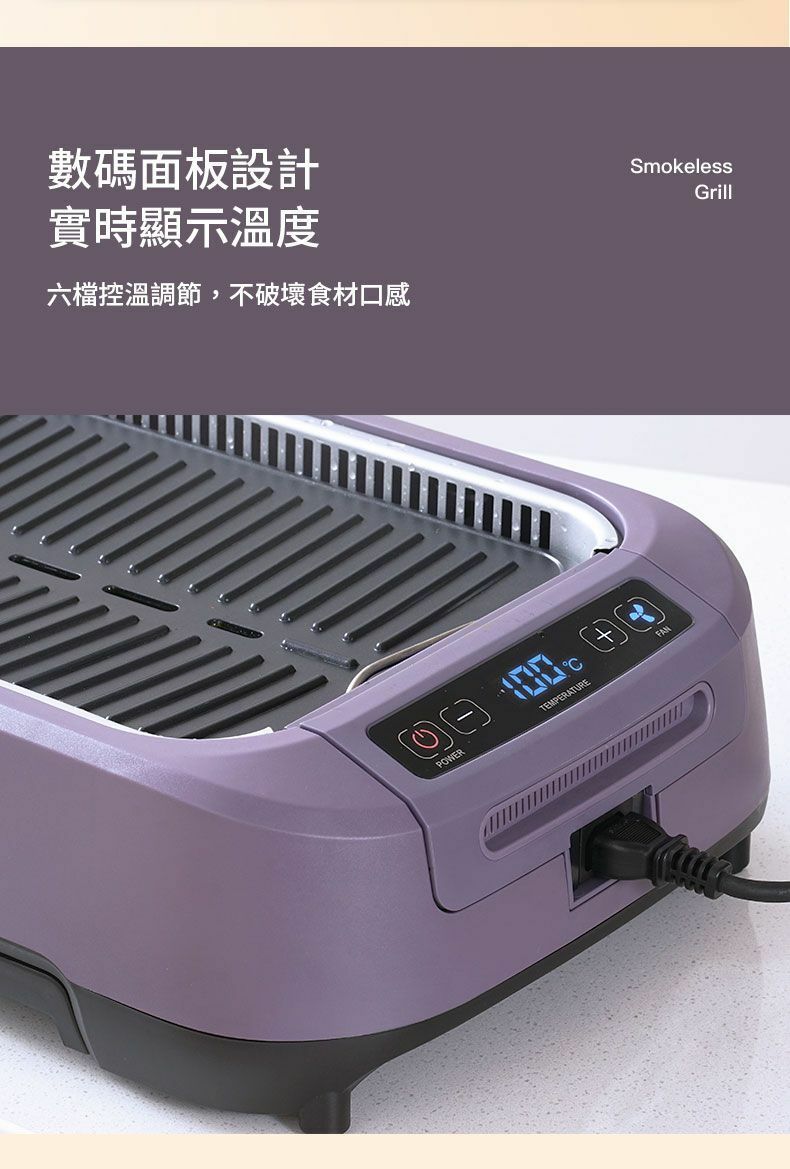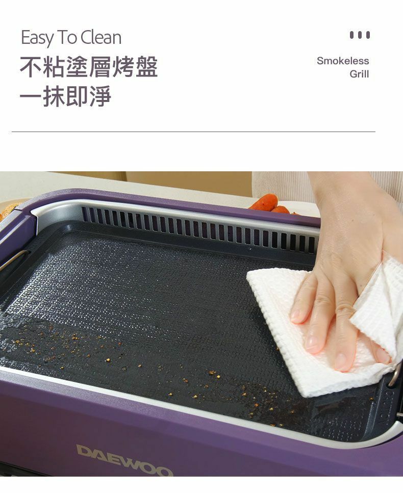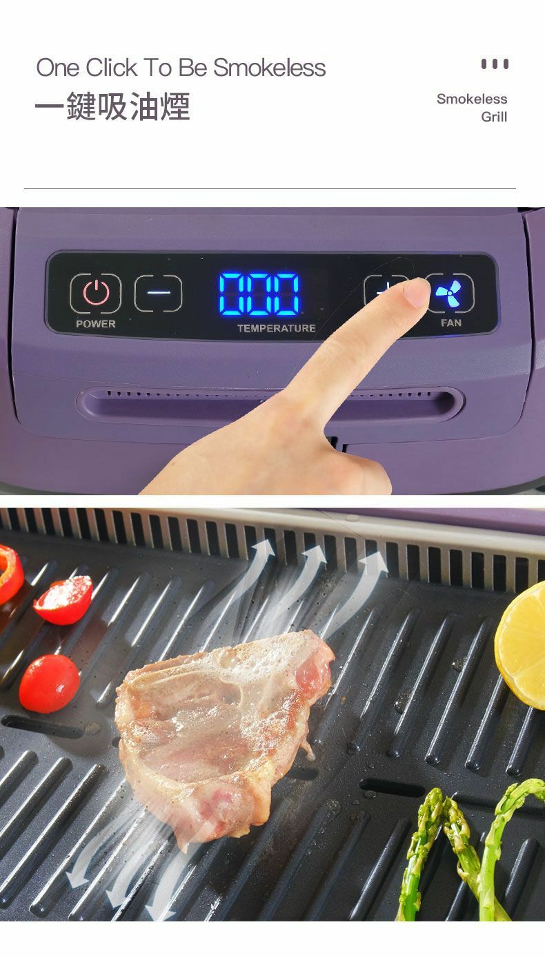 韓國大宇推出最新的S19 Pro 無煙燒烤爐,產品採用薰衣草紫色, 機體線條圓滑流暢, 雙U型發熱管設計, 使整個烤盤加熱無死角,更能轉換受熱均勻,燒烤時無需經常翻動食物,另産品的雙重控煙內核芯設計,採用內循環吸油煙,水冷過濾技術,側面有35個垂直吸風口,快速吸風抽煙。數碼面板設計實時顯示溫度, 操作更容易, 另抽屜式接油盤設計, 方便清洗。
