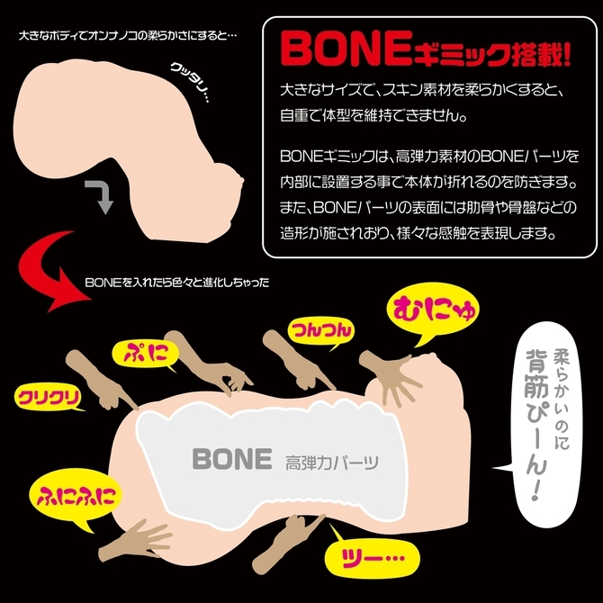 プレミアムで柔らかな感触の外側素材と、高弾力なBONEパーツ、さらにその内側は超ソフトゲルと高刺激粘膜素材の組み合わせで、上質なもっちりトロける癒し系の柔らかさを表現。