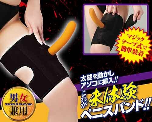 バンドの穴に吸盤付きディルドを通し、膝サポーターの要領で巻きつけ挿入するだけ!!腰を振らずにプレイが可能。